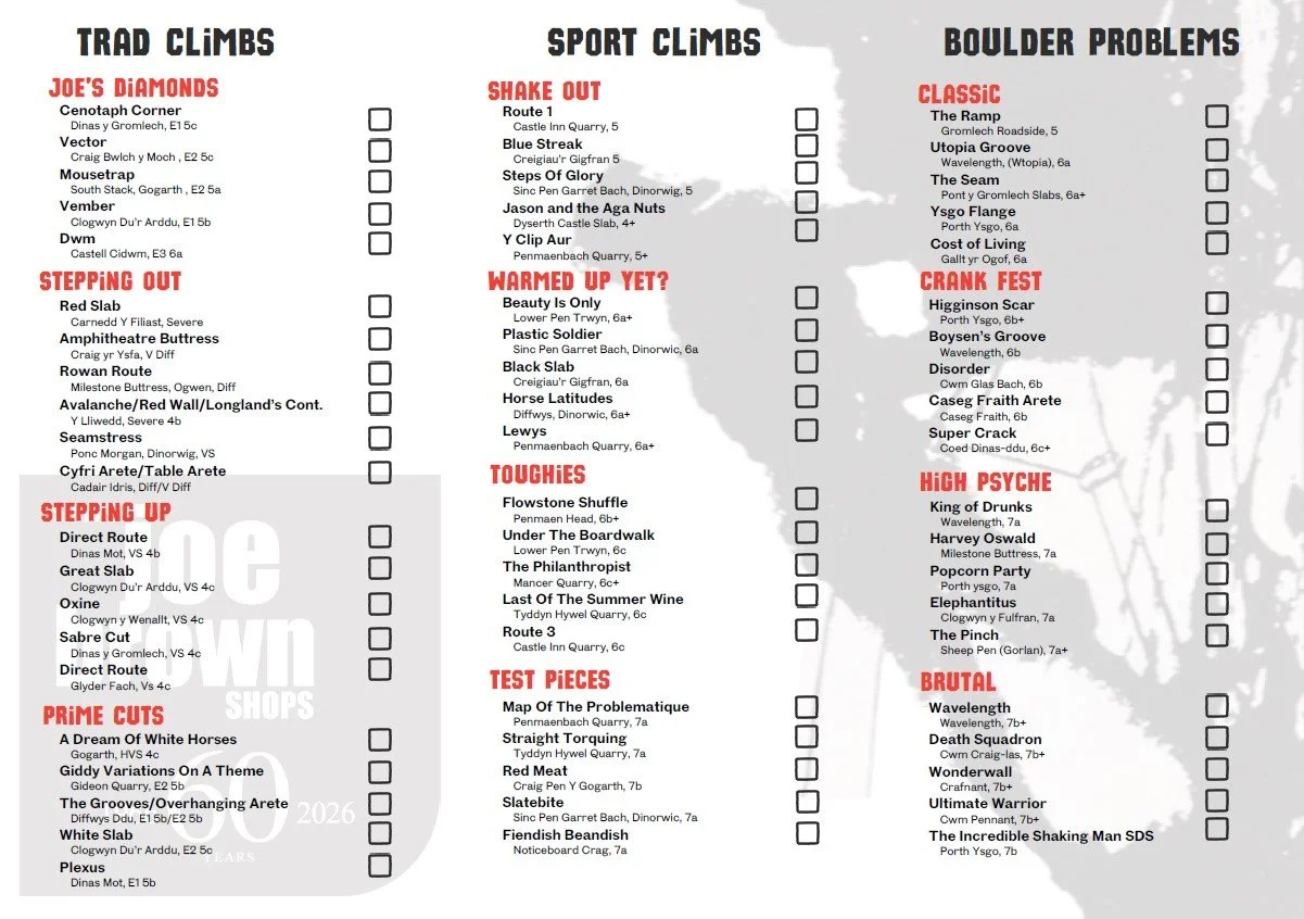 Pick up a tick list from our Llanberis or Capel Curig shops or hop online to our comp page on UK Climbing
